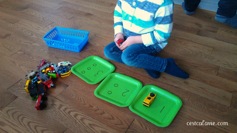 Lorsque je vous suggère de choisir des objets à compter en fonction des intérêts de votre enfant, voici un exemple! 🙂 Mon fils adore les voitures! 🙂 J’ai utilisé des assiettes de carton dans lesquelles j’ai inscrit les chiffres de 1 à 3. On y retrouve aussi des cercles pour que l’enfant puisse visualiser chacune des quantités qui va avec le chiffre! Ensuite, il peut déposer les voitures dans les cercles.