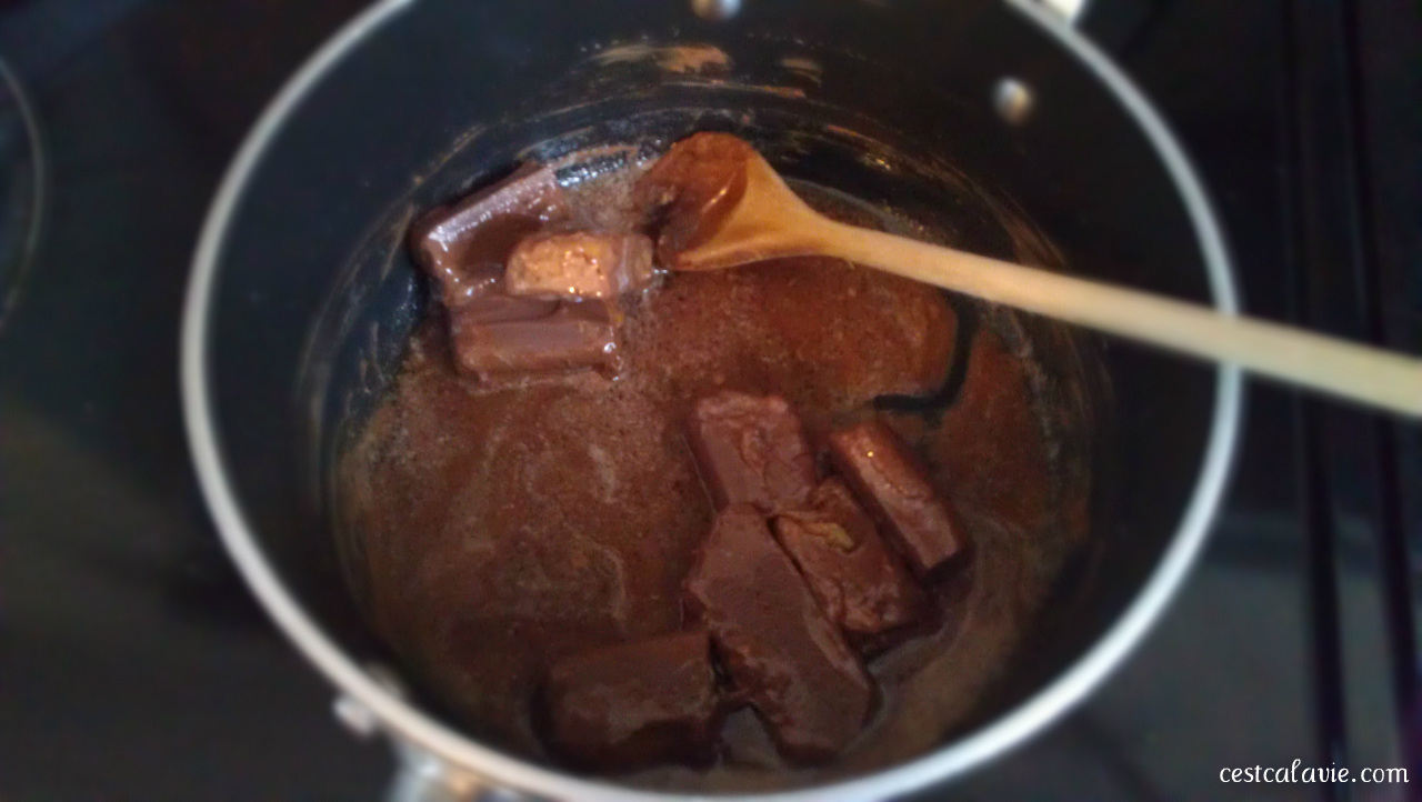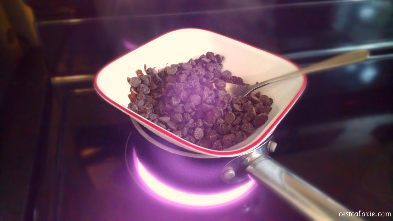 5- Faire faire les pépites de chocolat dans un bain marie (voir la photo pour un bain marie fait « maison ») 🙂