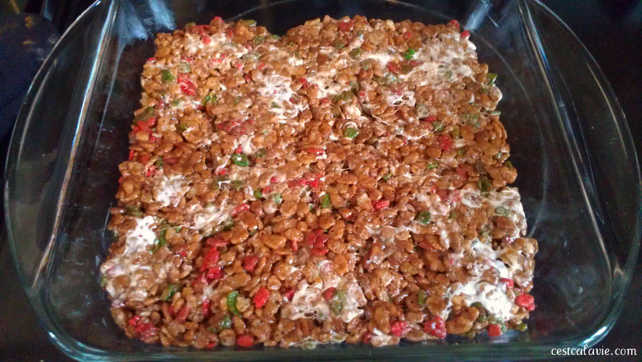 6- Étendre le chocolat fondu sur le mélange de rice krispies et réfrigérer pendant quelques heures avant de servir!