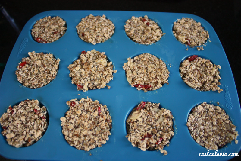 3. Pour faire cette collation pour boîte à lunch, j’ai utilisé un moule pour minis muffins en silicone. Il est important de bien compacter le mélange. Si vous n’avez pas de moule comme celui-ci, vous pourriez aussi déposer des petites boules du mélange sur une plaque à biscuits tapissée d’un papier parchemin ou encore un autre moule à muffins bien graissé.