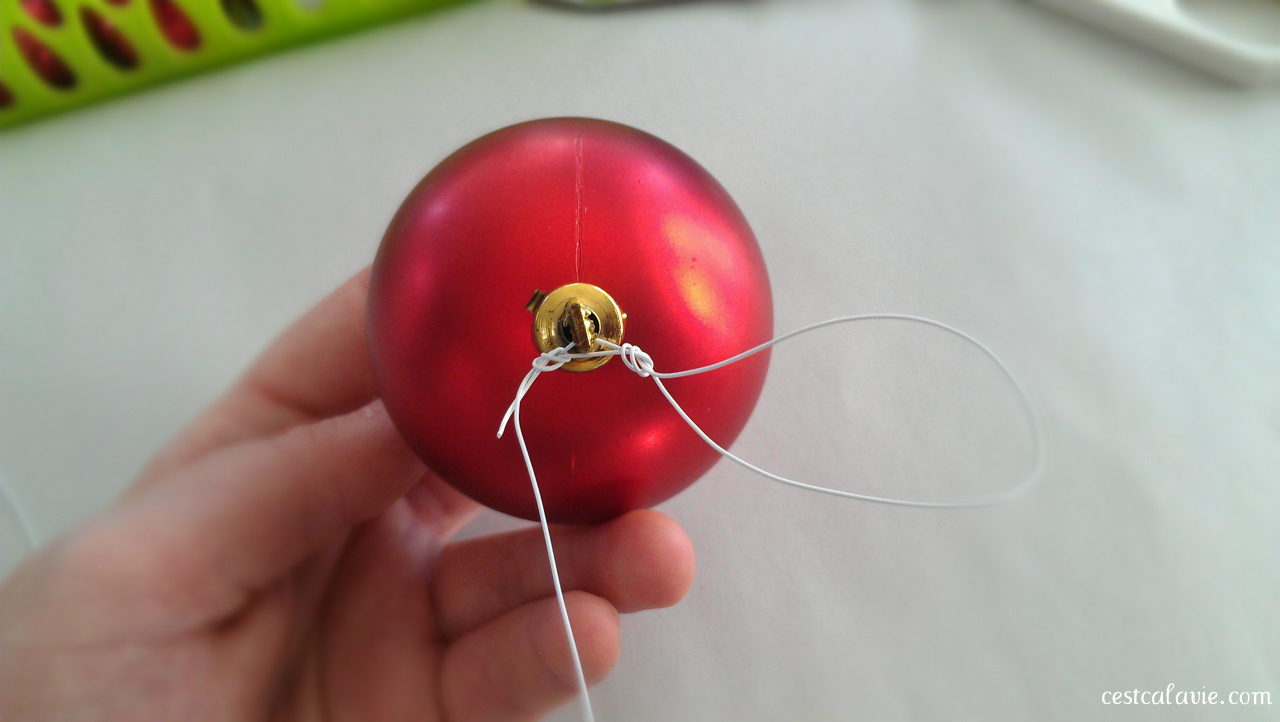 - Vous êtes maintenant prêt à enfiler les boules de Noël! Je vous suggère de varier les tailles de boules de Noël tout au long du bricolage. Par exemple, vous pouvez enfiler 2 grosses boules et ensuite une petite boule et poursuivre ainsi…