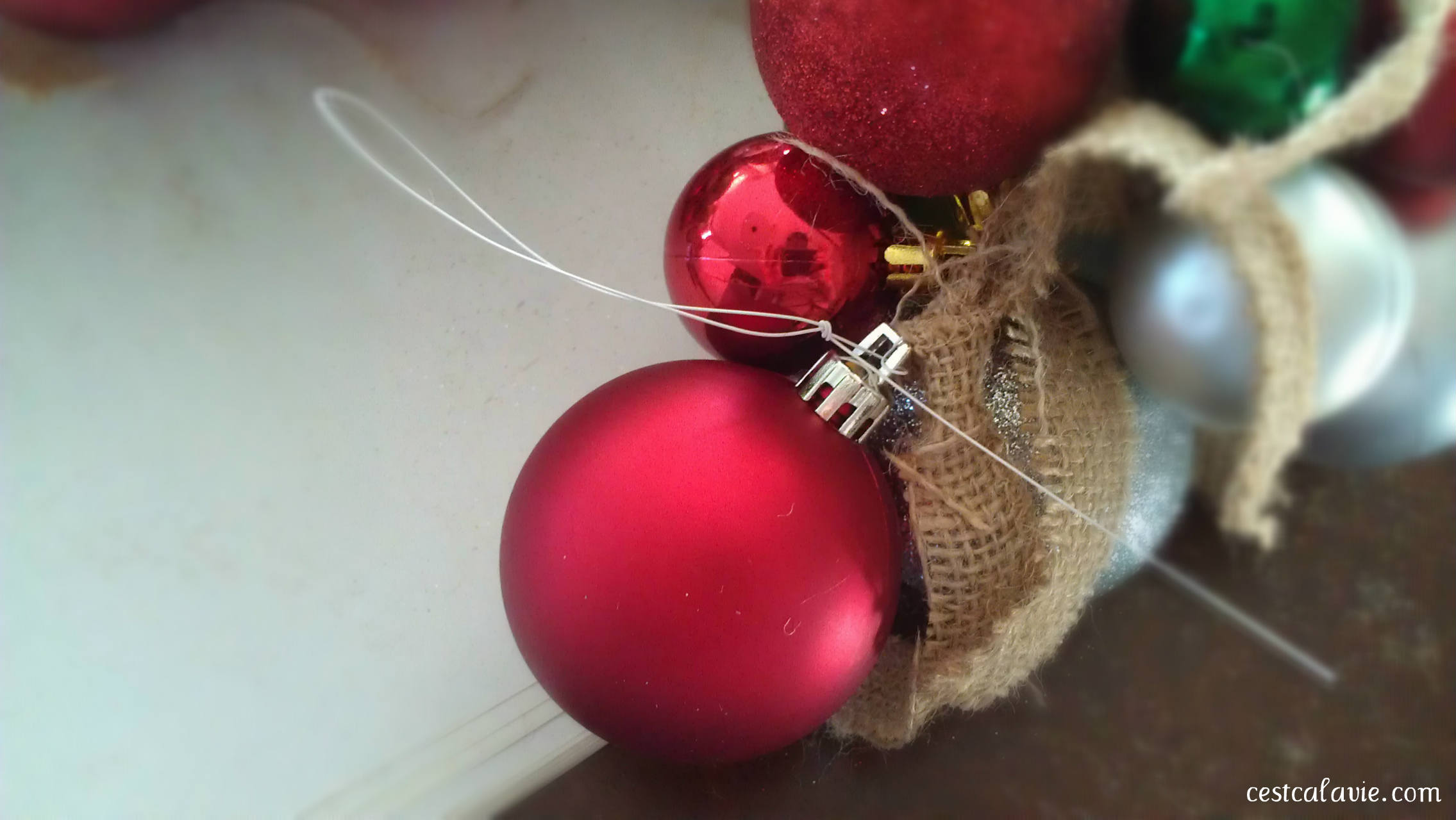 - Ensuite, prenez une première boule et fixez-la avec la corde afin de former une attache. C’est pratique si vous souhaitez suspendre la guirlande de boules de Noël. Assurez-vous que c’est bien solide.