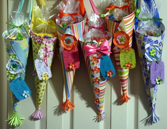 Mon coup de coeur! 🙂 Ces petits paniers remplis de bonbons et de couleurs plairont certainement à tous! Pour réaliser des paniers comme ceux-ci, utilisez des papiers variés pour créer des cônes. Vous pouvez ensuite les décorer avec des boutons, des autocollants, des rubans, des petits messages, etc. À l’intérieur, un sac de bonbons a été déposé dans chacun des paniers! 🙂