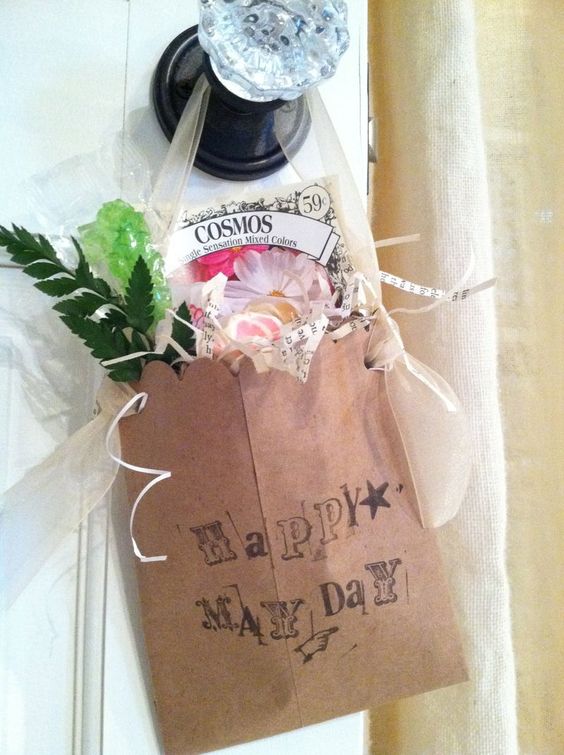 Une autre idée de panier de mai…Vous pouvez également utiliser un simple sac de papier que vous décorerez avec des estampes, un ruban et même en utilisant des ciseaux dentelés. À l’intérieur du sac, pourquoi ne pas y mettre des enveloppes de semences de fleurs? Un joli cadeau du printemps! 🙂