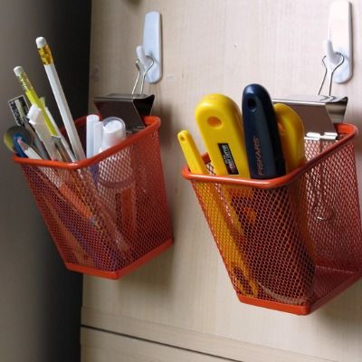Vous pouvez suspendre des petits paniers à l’aide de crochets auto-collants et de pinces. Une façon simple et économique pour ranger certains petits objets.